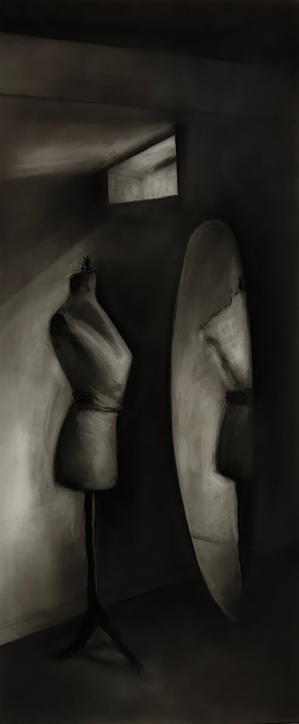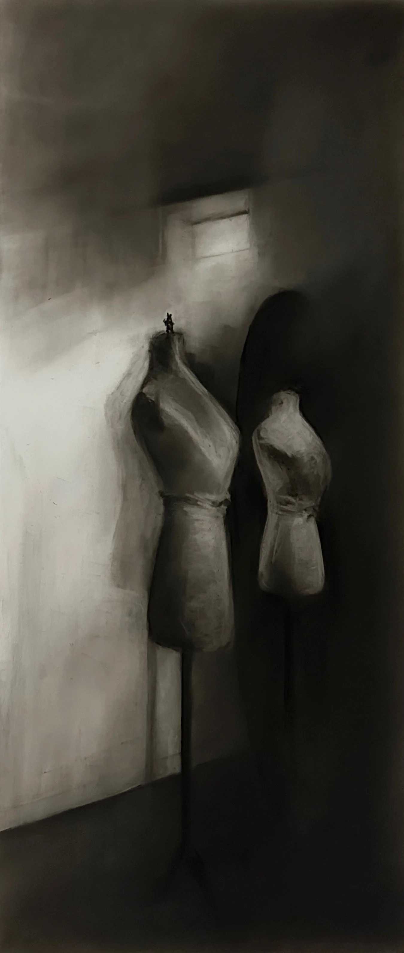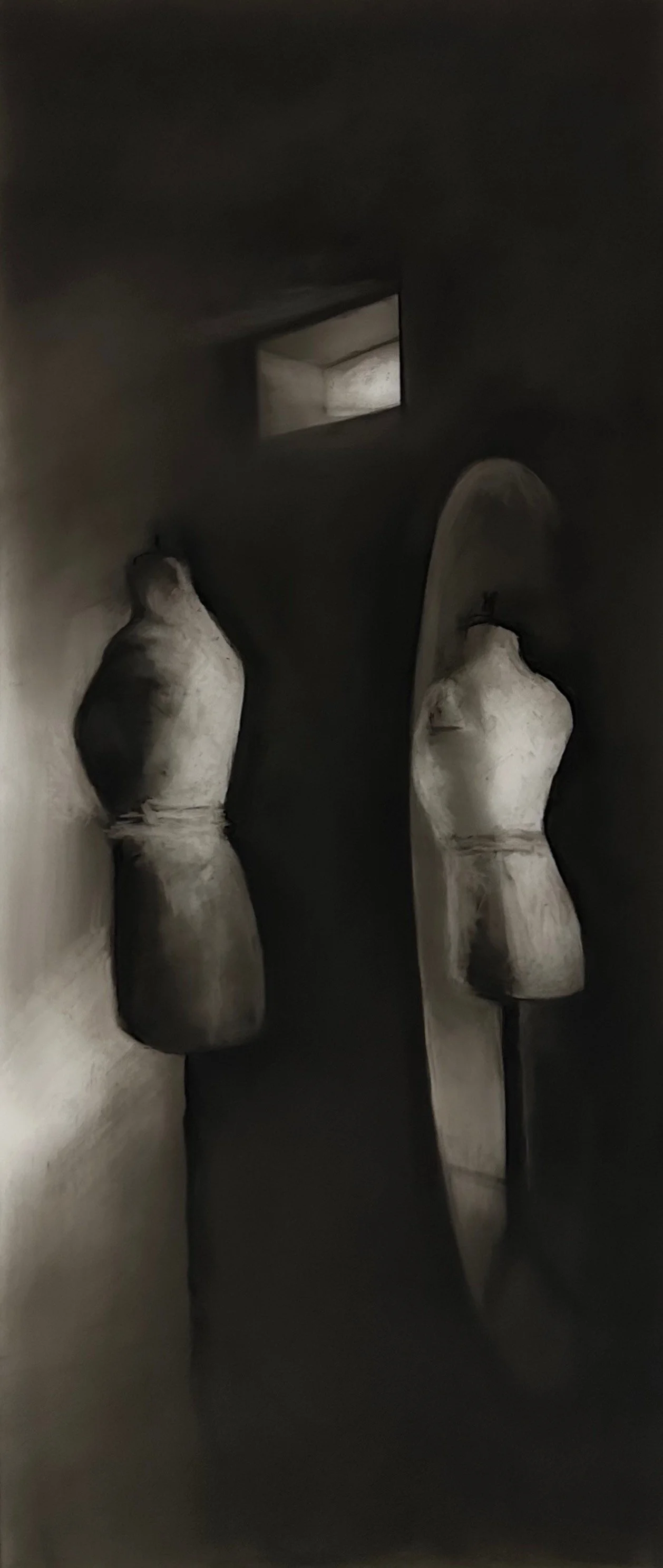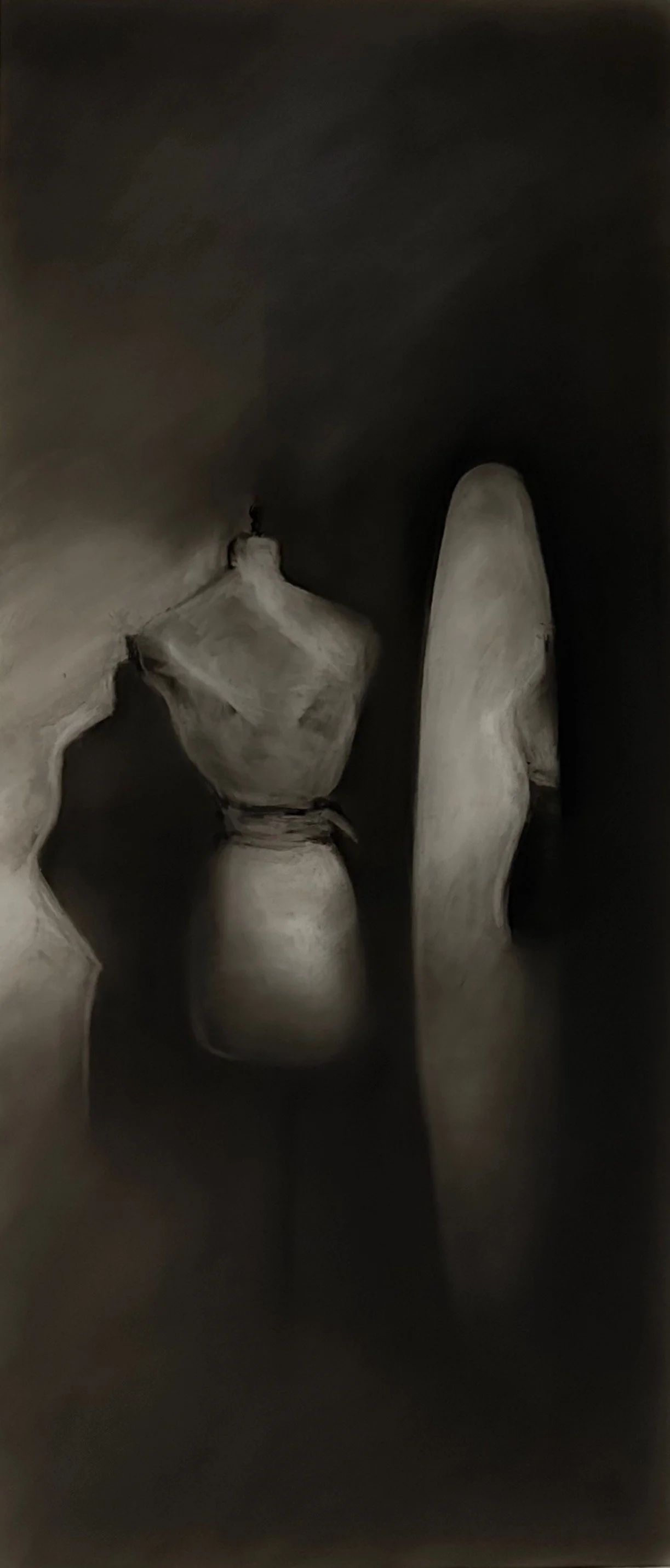 An Intimate Conversation 1 - 1, 2025. Charcoal on Frosted Mylar - 30 x 13 in